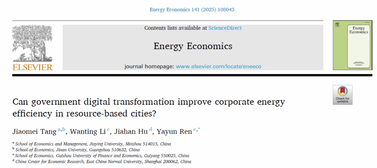 近日,我校经济与管理学院教师唐姣美博士以第一作者在中科院1区期刊《Energy Economics》上发表了题为“Can government digital transformation improve corporate energy efficiency in resource-based cities?”的学术论文。该研究围绕资源型城市企业可持续发展中的能源效率问题,系统分析了数字政府建设的促进作用。研究基于中国资源型城市上市公司数据,发现数字政府建设能够显著提升企业能源效率,且该效应在多项稳健性检验下依然可靠。同时,数字基础设施水平、环境政策严格性、地方财政约束及企业所有制结构等因素对这一效应具有显著影响。进一步分析表明,能源效率的提升主要源于技术创新的推进和非生产性支出的减少。该成果为数字治理赋能绿色低碳转型提供了有力的理论支撑与实践参考,凸显了数字政府在推动资源型城市高质量发展中的关键作用。(经济与管理学院)